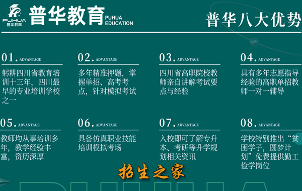 四川普华单招培训学校凭借其资深的教师团队,扎实的教学质量,优异的升学成果和半军事化管理模式在成都地区拥有较高的知名度和良好的口碑,多年来,已帮助众多学子成功踏入理想院校!咨询电话:13348832372(钟老师)!!!
