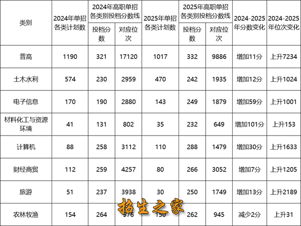2025年,四川水利职业技术学院高职单招各大类投档最低分及位次排名均优于2024年投档情况。2025年四川水利职业技术学院高职单招普高类录取分数投档线332,位列全省双高院校第10,分数位次较去年上升了7234。中职类所有专业大类录取分数位次都较去年有了明显提升,其中土木水利类、电子信息类、计算机类、财经商贸类、旅游类投档最低分位次较去年相比提升较大,分别为1024位、1001位、1633位、1205位以及2189位,各专业大类生源质量持续提升。