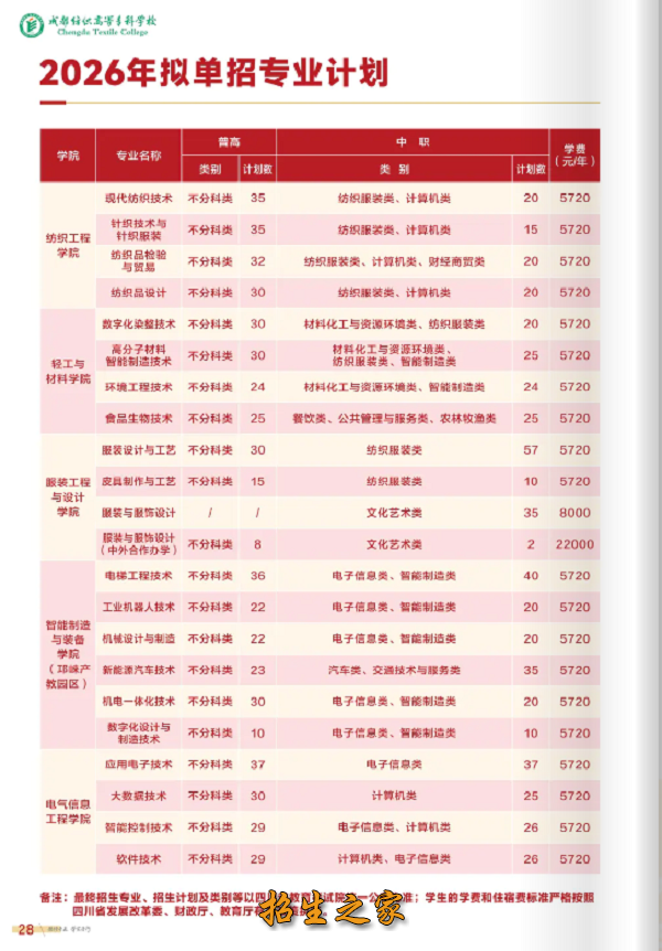 成都纺织高等专科学校是四川省政府举办的公办全日制高等职业院校,前身为1939年创办的国立中央技艺专科学校。现有12个二级学院(教学部),开办专业45个,是全国唯一服务纺织服装全产业链的高职院校,建有服务轻工纺织产业的国家高水平专业群1个、省级高水平专业群2个、国家示范专业3个、国家骨干专业4个、职业教育本科专业5个。