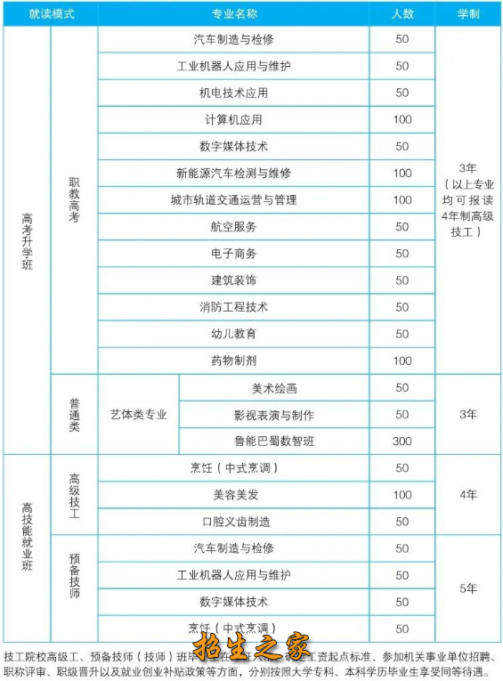 学校开设药物制剂、新能源汽车检测与维修、建筑装饰、美容美发、烹饪(中式烹调)、幼儿教育、数字媒体应用、计算机应用、汽车制造与装配、航空服务、城市轨道交通运输与管理等20个专业。学校以“因材施教,以人为本,立德树人”办学理念,以“学有特长,教有特点,校有特色”为办学愿景,以“崇德载道,敏学思进”为校训。秉承“融情教育,人性化管理”为育人理念。学校有“专业好,教学实,管理严,校风正,就业优”的良好声誉,坚持规模扩张与内涵提升并举,升学与就业并重。深化校企合作,打造升学通道,创新教学模式,促进产教对接,全面提升办学质量和服务水平。
