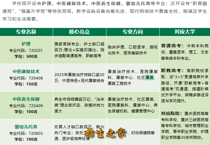 学校已有近40年办学积淀,经重庆市教育委员会、重庆市卫生健康委员会批准设立,是一所全日制中等职业学校(学校代码:536)。学校现设山洞、大学城两大校区,总占地200余亩,建筑面积超6.4万平方米,在校学生近3000人。