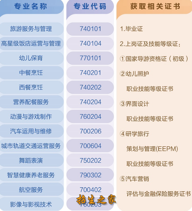 学校开设有高星级饭店运营与管理、旅游服务与管理等11个中专专业和旅游管理、学前教育、动漫与游戏制作3个“3+2”中高职连读专业。学校坚持校企合作,深化产教融合,与多家知名企业开展联合办学。学校是全国首批“1+x”证书制度汽修专业试点单位,是西安市职业教育现代学徒制首批试点院校。