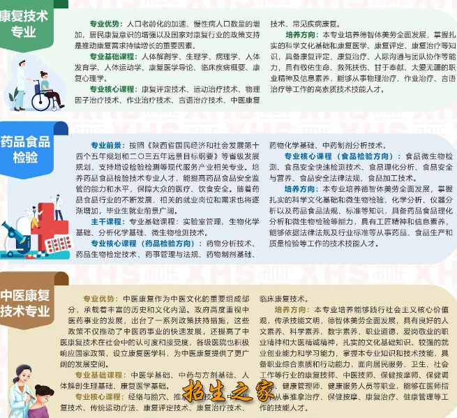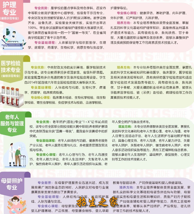 学校现开设护理、医学检验技术、康复技术、药品食品检验、老年人服务与管理、母婴照护、中医康复等七个专业。护理专业是“市级重点专业”,护理、医学检验技术两个专业同时是“市级示范专业“和“省级示范专业",2023年,护理和医学检验技术两个专业获批“陕西省高水平示范专业建设项目”。学校是市级现代学徒制试点项目校,老年照护(首批)、母婴护理(第四批)两个专业”1+X”证书试点院校。