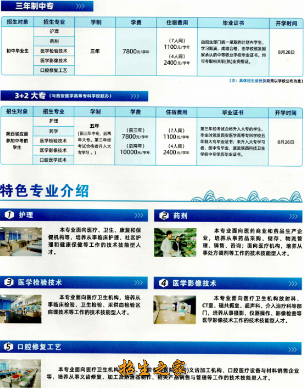 学校开设了护理、药剂、医学检验技术、口腔修复工艺、医学影像技术等专业,其中市级示范专业2个、市级重点专业4个。学校教学资源丰富优越,师资队伍力量雄厚,获得全国教师教学能力大赛二等奖、陕西省教师教学能力大赛一等奖等荣誉,并拥有3名省级教学能手。